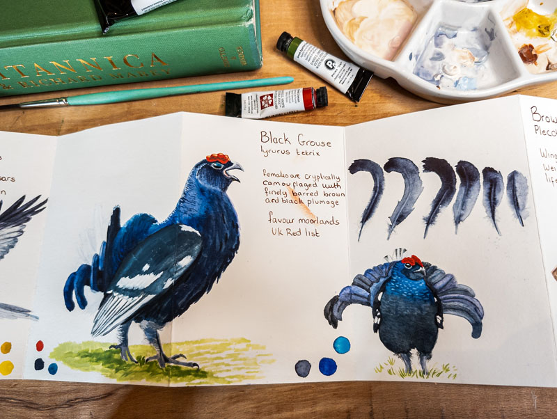 Sadly, I’ve still never seen one. I’ve had to study the Black Grouse through online content, in books and through photography. And from an artist’s perspective, the male Black Grouse is nothing short of a showstopper. So I’m slightly disgruntled never to have encountered one! Their plumage is a deep, iridescent blue-black, shimmering with hints of violet and green in the right light. This isn’t a flat black; it’s a living, breathing colour that demands careful layering to capture its complexity.