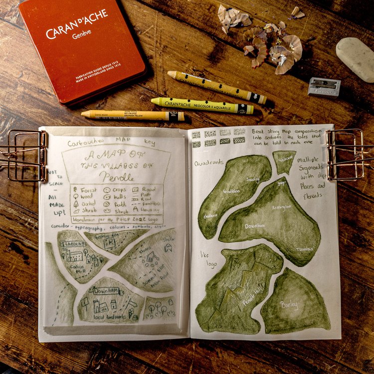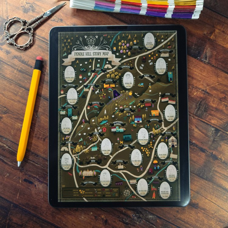 As August rolled in, the research and narrative began to crystallize, prompting me to translate my vision into tangible drafts at A2 scale. With each iteration, the map’s design evolved in tandem with the maturing content, gradually revealing the overarching story that lay beneath the surface. Melding traditional and digital techniques, I brought the Storymap to life through an intricate blend of traditional mixed media and digital software software. Every stroke and pixel was carefully orchestrated to capture the essence of our local communities, imbuing it with elements like the evocative poem ‘Pendle Grammar’ by Seàn Hewitt.
