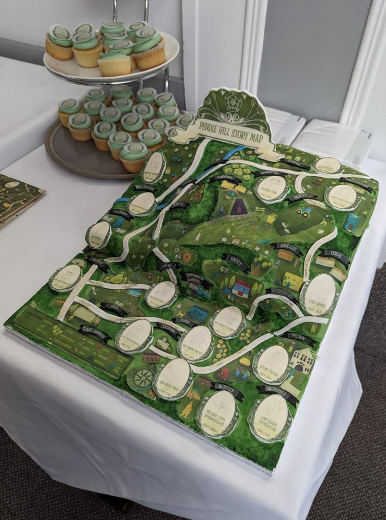 The culmination came in October, as the Pendle Hill Landscape Partnership project drew to a close. The Storymap, an embodiment of artistic expression and community collaboration, underwent a delightful transformation, emerging as a spectacular cake. Each radical individual has their face adorned with matching cupcakes, symbolizing unity and celebration in a truly delectable way! This confluence of art and confection has hopefully left a lasting impression etched in both memory and taste buds!!