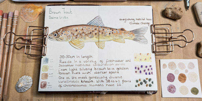 Brown Trout (study) Name: Brown Trout (Salmo trutta)2025. Watercolour and Gouache on paper, 14.5cm x 13cm One of the Forest of Bowland’s ‘Champion Species’. PrevPied Flycatcher (study)NextEurasian curlew (study)
