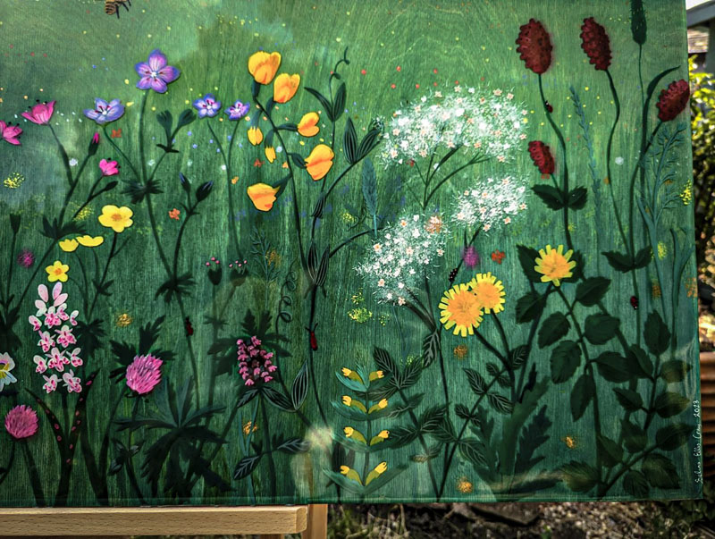 A handcrafted sign with multiple reverse fixtures, housed on a sturdy artist easel. Doubles as both a sign and a spotting board containing species found on local wildflower meadow sites within the ANOB. To be viewed at a distance and close up, with an aesthetic painterly vision capturing National Meadows Day.