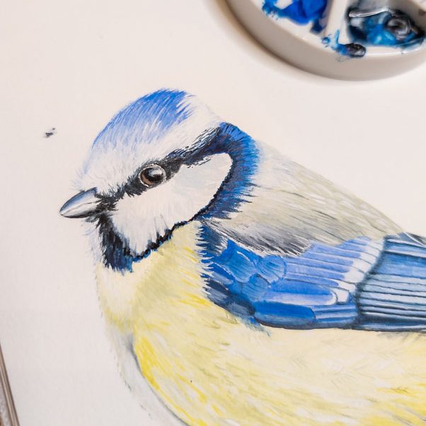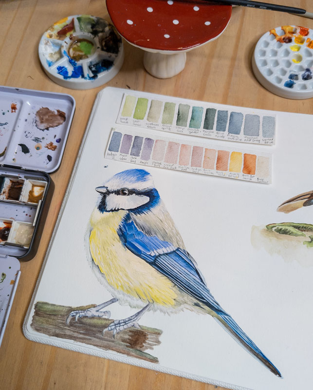As you can see, I reluctantly dipped my brush into this brighter yellow/green spectrum to capture a recent blue tit (Cyanistes caeruleus) visitor. I had to convey the sheer, unadulterated flashiness of my feathered friend in all its acidic glory – who, I should add, was also incredibly noisy. A tiny, brilliantly coloured diva, truly, with the lung capacity of an opera singer.