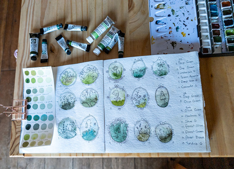 Urgh, honestly, I haven’t a clue. I’ve had the same tube for what feels like an eternity, and I keep giving it the cold shoulder, bypassing it for its more understated comrades. It’s neglected in my paintbox. Part of me suspects it’s because there are other greens I’m completely besotted with, like Undersea Green (uff, chef’s kiss!). Now that one’s a bit less of a show-off and really knows how to make muted colours pop. It’s the strong and silent type of the green world.