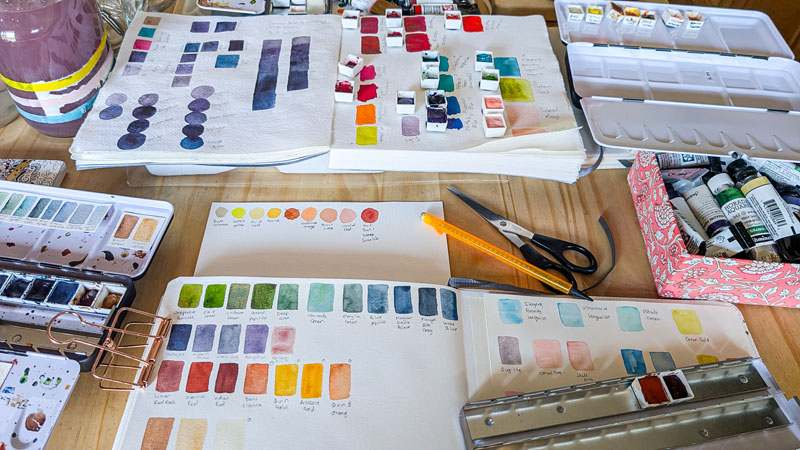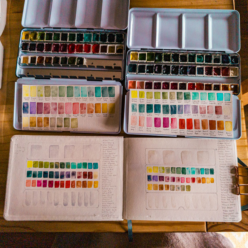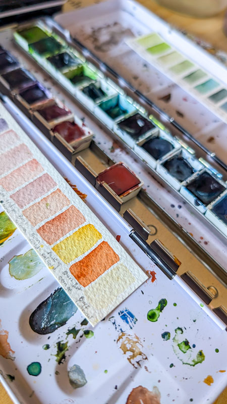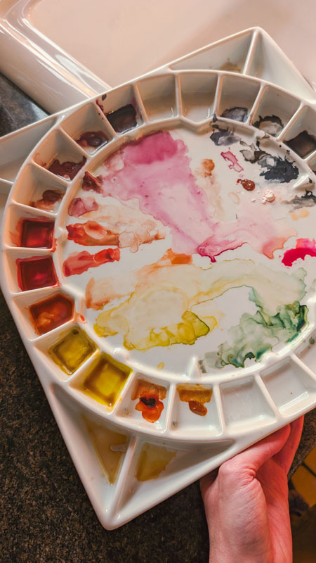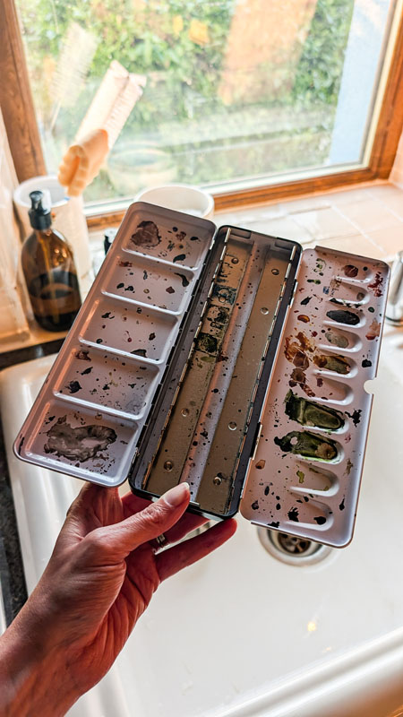 I rarely wash my palettes, as I’m usually determined to use up every single drop of colour – paint is expensive, and nothing is truly wasted! But I do think a yearly clean-down of my watercolour mixes, especially, is a satisfying way to get rid of any muddy pools of unwanted paint. It feels good to start the months ahead with new colour combinations, experimentation, and swatches.