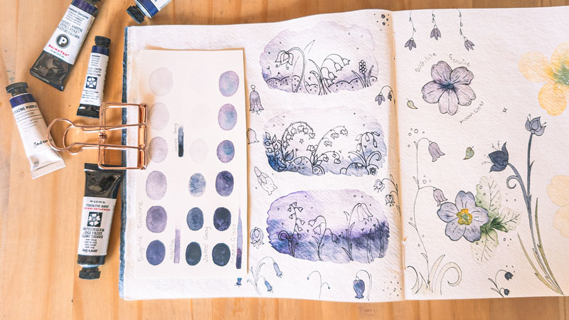 When I’m outside and working in a more loose, playful fashion, I prefer a pen and wash, with mixes of watercolours that granulate. I have tiny little travel palettes by Etcher that are great companions. And my watercolour tins, where I keep pans filled with tubes of paint, are very transportable!