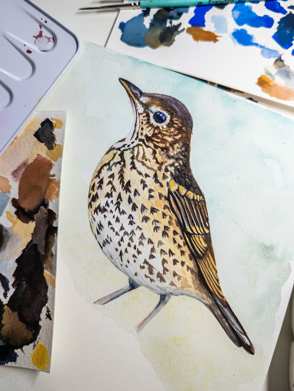 Painting that little song thrush was an absolute treat. I leaned heavily into transparent ochre and yellow ochre to capture that subtle warmth in its plumage, grounded with warm sepia and burnt umber. The secret, I find, is to mix in touches of indigo blue and dioxazine purple to neutralise the browns and bring depth, all without touching black. Black, I’ve learned, can often deaden birds that have that inherent ‘glow’ or vibrancy about their feathers. It’s all about letting the light live in their colours.