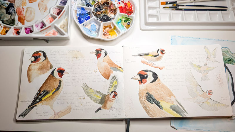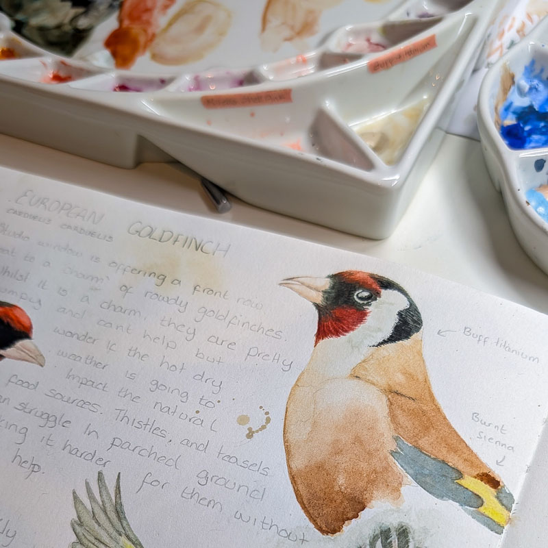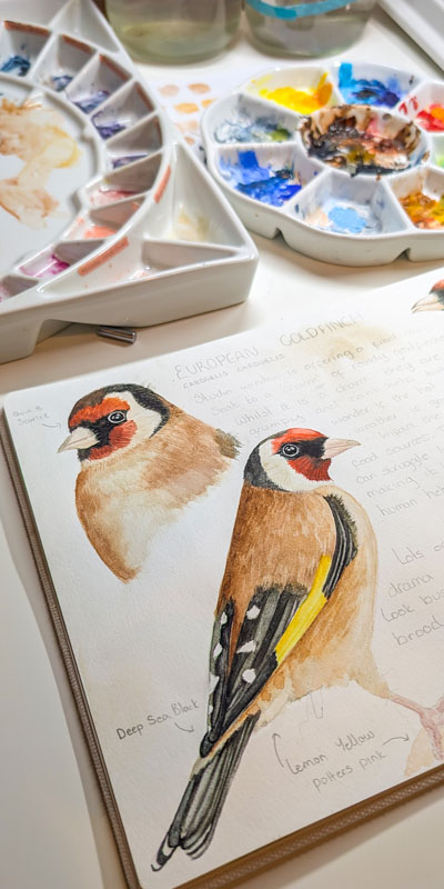 This year, one of my favourite acts has been spending time with a charm of goldfinches (Carduelis carduelis). They started visiting my garden, right outside my studio window, back in March.