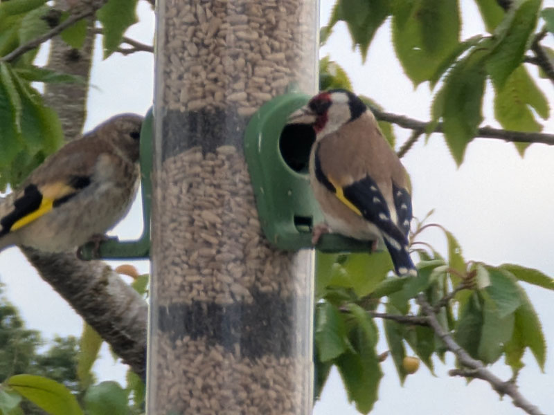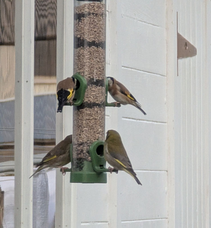 Then, one or two vibrant red faces appeared, which spiralled as word spread fast! This feeder was packed with niger and sunflower seeds, and the goldfinches began arriving daily. They swooped in as pairs or small groups for a nibble.