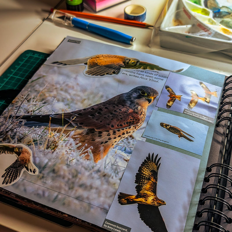 - It’s good Visual Reference: A scrapbook is a fantastic way to collect visual references. I’ve been using my pages to document the UK birds, flowers, and mammals I see around the salt marshes here in Lancashire. It’s a great way to build a personal library of visual information that is both a record of what you’ve seen and a source of inspiration for future projects.